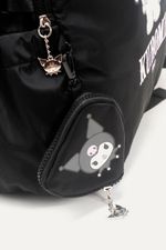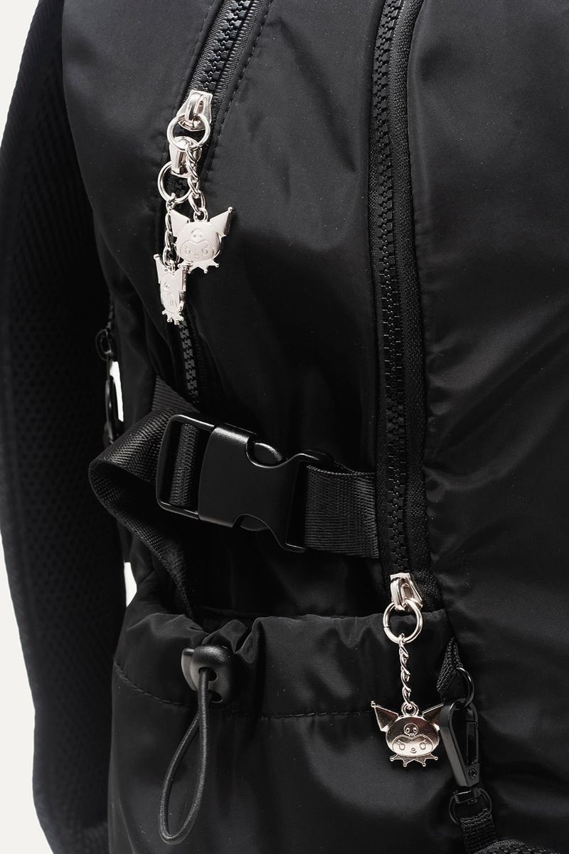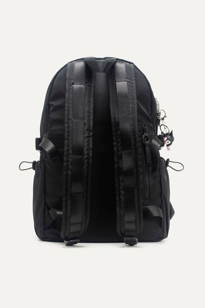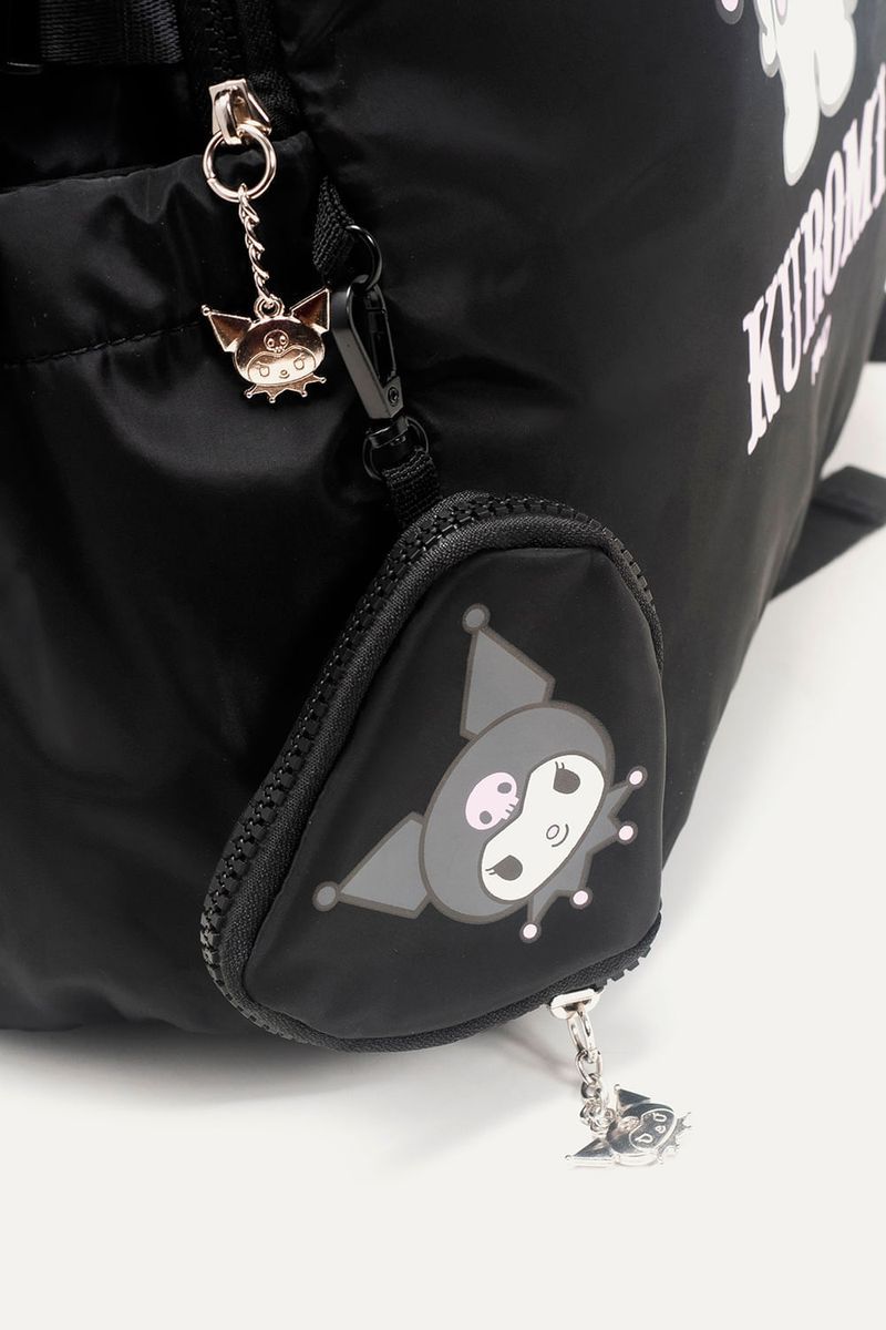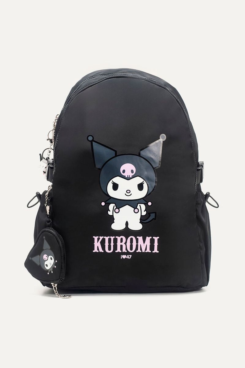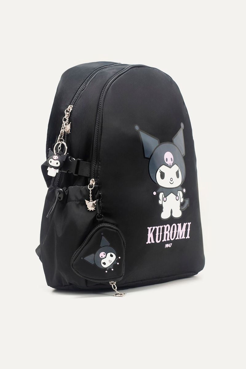 Mochila con estampa de "Kuromi" cuenta con dos compartimientos principales con cierre y tiracierres diseño exclusivo Kuromi, el más grande con división interna para colocar tu laptop, y el otro para artículos de fácil acceso. Tiene un llavero con dije colgante. Además, incluye un monedero colgante con arte vinílico. En sus laterales, presenta un contenedor con elástico regulable, ideal para botellas o taza térmica. Tiene un bolsillo escondido en la espalda para guardar objetos valiosos de forma discreta y segura, junto con una faja para engancharla fácilmente al carry on. Sus tiras regulables permiten un ajuste cómodo y anatómico. Confeccionado en una tela repelente al agua y de fácil limpieza. Producto con licencia oficial Hello Kitty / San Rio.