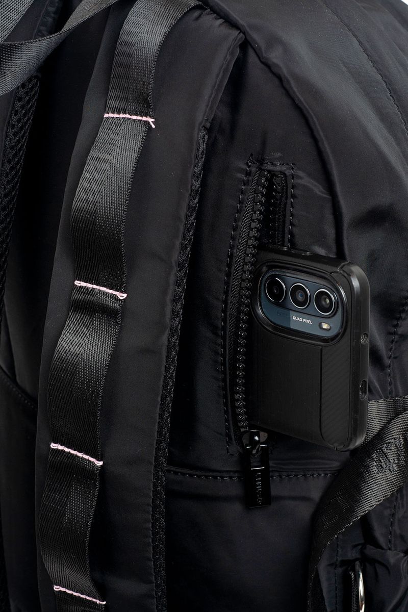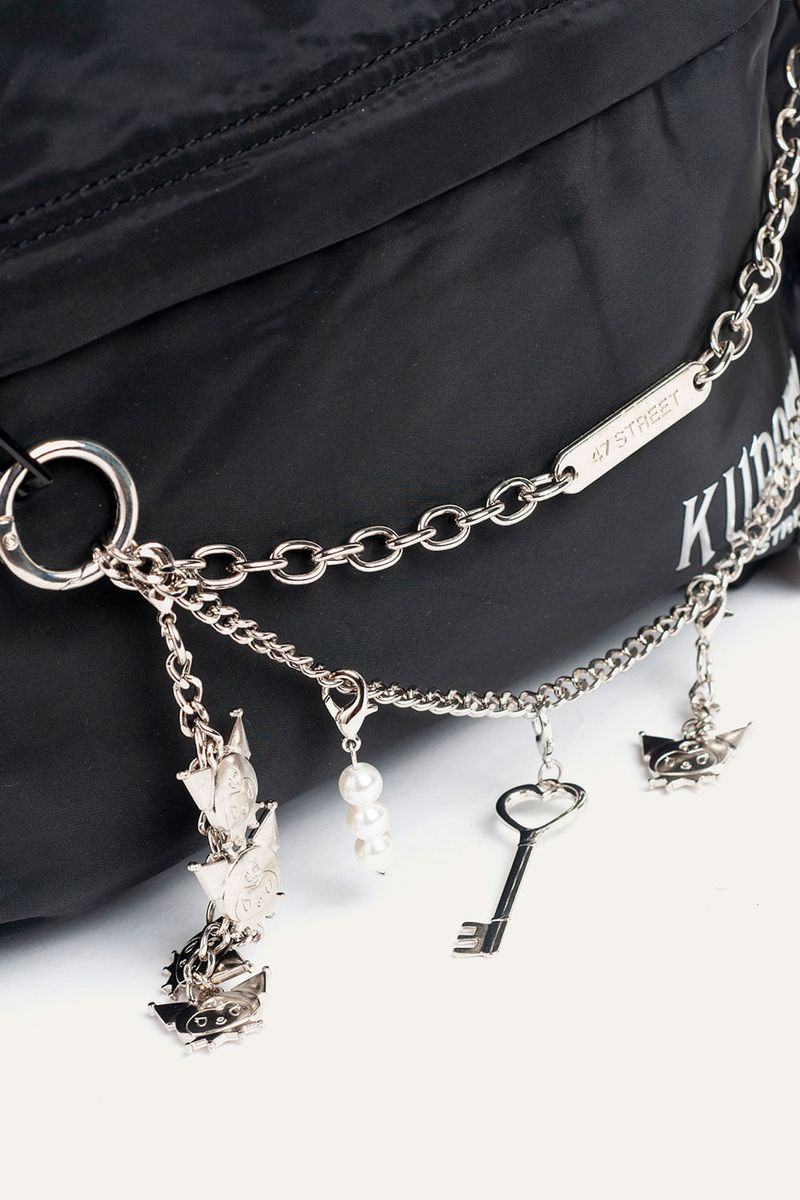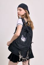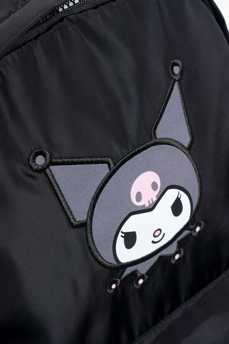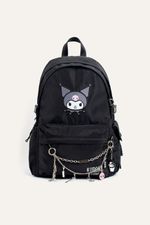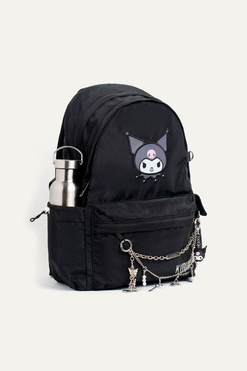 Mochila de 18” con estampa de Kuromi, ideal para organizar todo de manera cómoda. Cuenta con dos compartimentos principales, bolsillo delantero y bolsillos laterales para botella. El compartimento principal incluye bolsillo para laptop y organizador interno. Suma bolsillo trasero para objetos de valor, tira para enganchar a valija y tiras regulables acolchadas para un ajuste confortable. Incluye reloj con doble cadena extraíble con charms removibles de Kuromi y llavero corpóreo de Kuromi. Confeccionada en nylon, material repelente al agua y de fácil limpieza. Producto con licencia oficial de Sanrio.