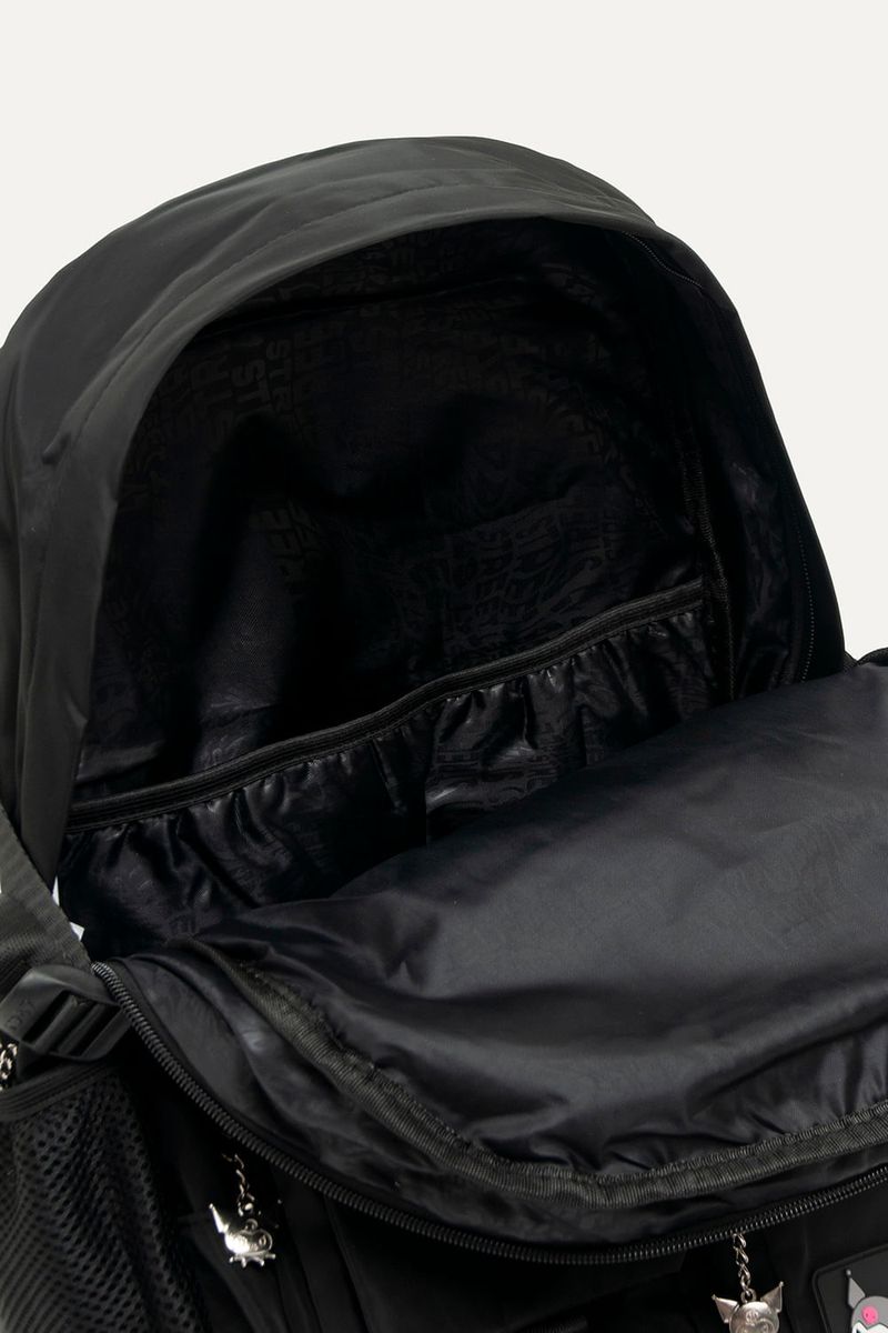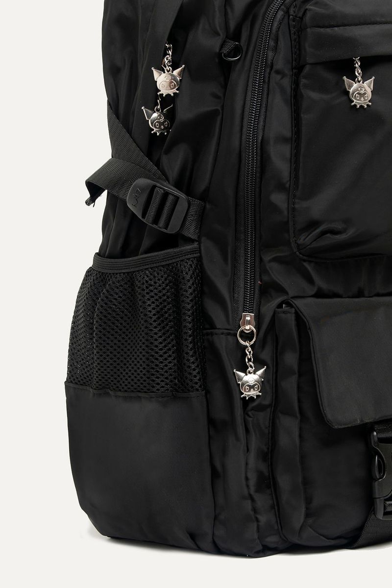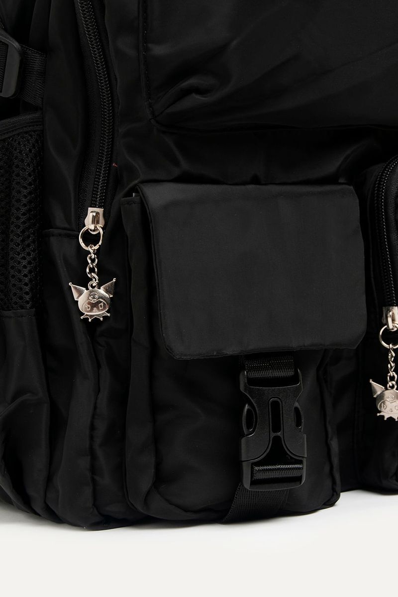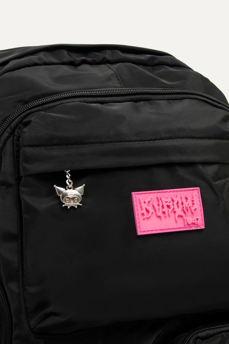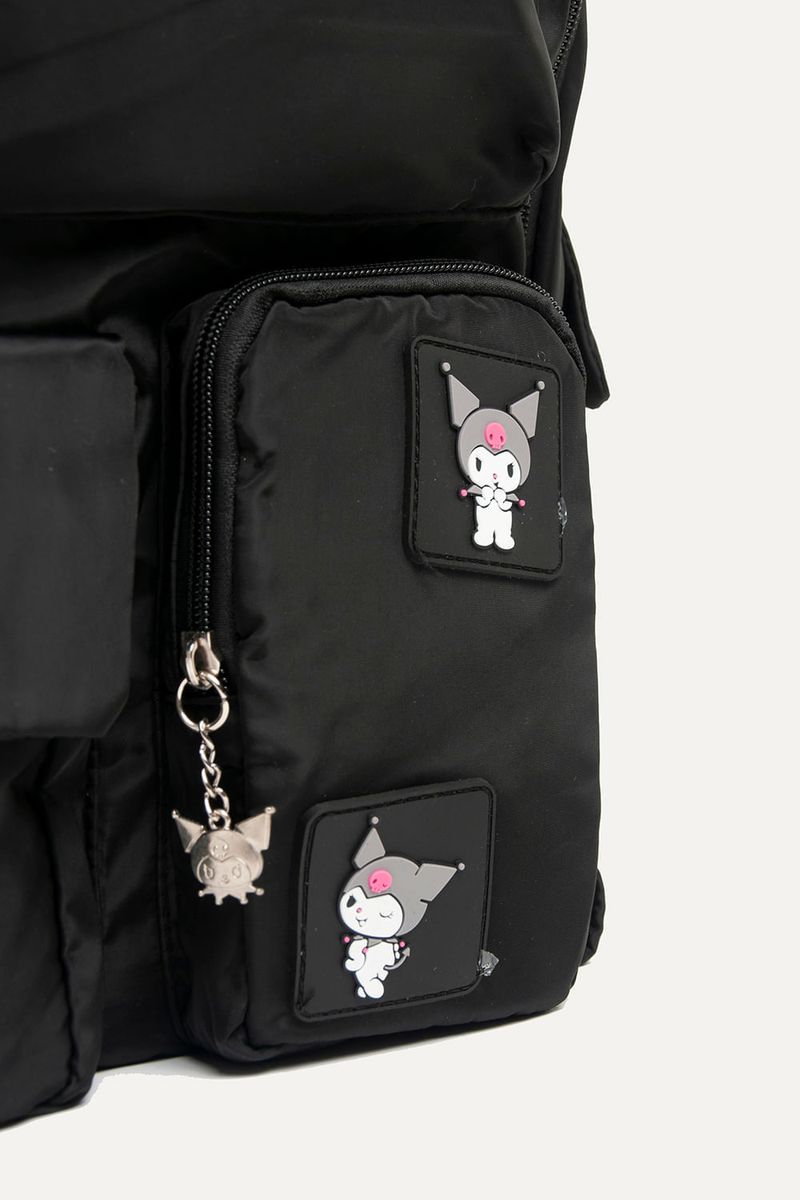 Mochila de Kuromi de nylon negra con muchos bolsillos para guardar todo lo que necesites. Con detalles como parches y tira cierres de Kuromi. Con cartuchera extraíble. Bolsillos laterales y compartimento interno para guardar la compu. Con tira para pasar el carry on.