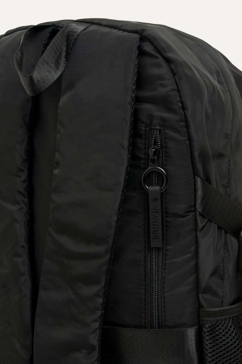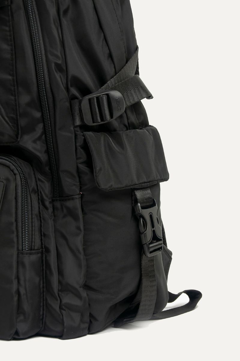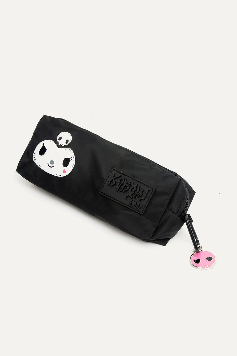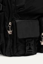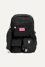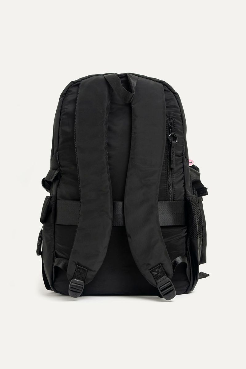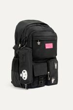 Mochila de Kuromi de nylon negra con muchos bolsillos para guardar todo lo que necesites. Con detalles como parches y tira cierres de Kuromi. Con cartuchera extraíble. Bolsillos laterales y compartimento interno para guardar la compu. Con tira para pasar el carry on.