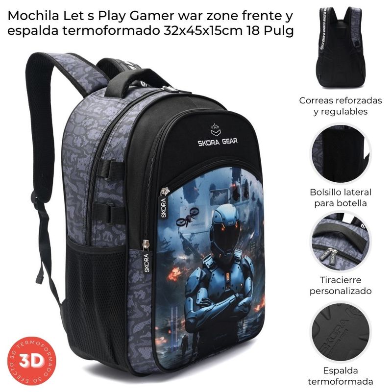 La mochila Skora Lets Play Gamer War es la elección perfecta para quienes buscan un diseño urbano y funcional. Con unas dimensiones de 45 cm de altura, 32 cm de ancho y 15 cm de profundidad, ofrece un espacio adecuado para llevar tus pertenencias diarias de manera cómoda y estilizada. Su material de poliéster asegura durabilidad y resistencia, ideal para el uso cotidiano.