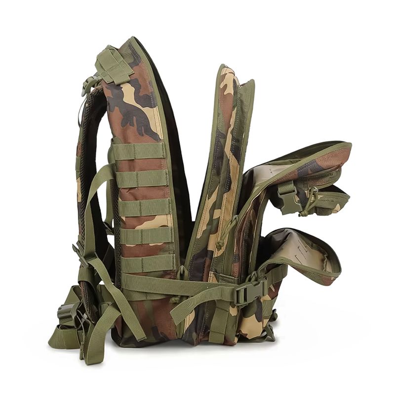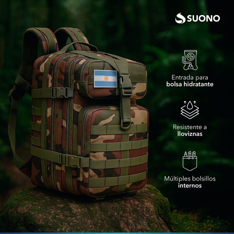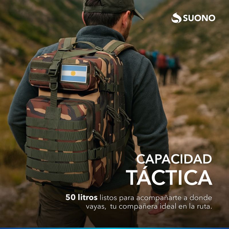 La Mochila Táctica Suono de 55 litros está pensada para aventuras intensas: trekking, camping, caza, pesca y uso outdoor. Su material Poliéster 900D ofrece máxima durabilidad, mientras que la espalda acolchada y mallada aporta ventilación y confort durante todo el día. El sistema MOLLE permite sumar equipo extra y adaptar la mochila a cada salida.