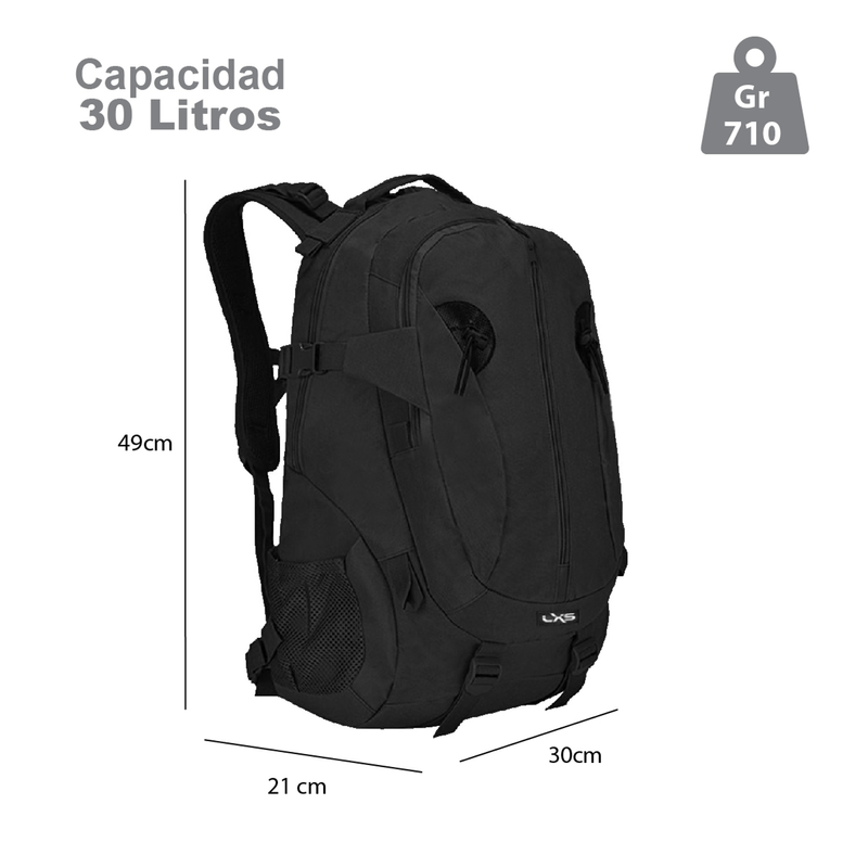 - Capacidad de 30 litros con varios compartimentos principales, bolsillos frontales y laterales para un acceso rápido y organizado.