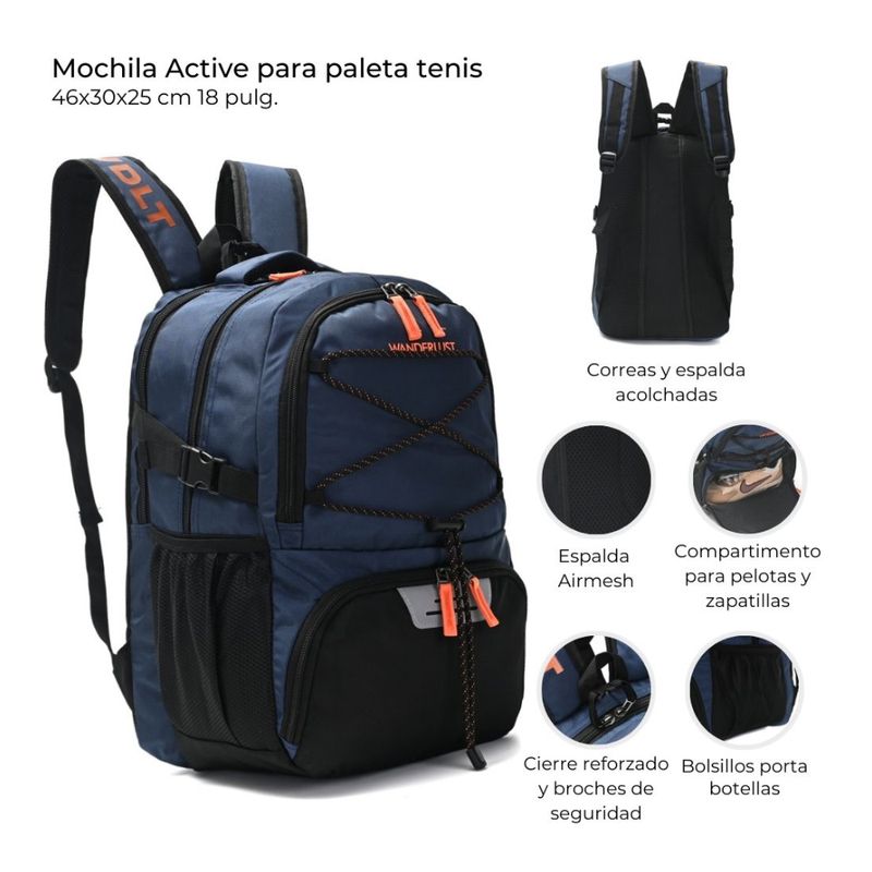 La Mochila Active de 18 pulgadas (46x30x25 cm) es la compañera esencial para los entusiastas del deporte, diseñada específicamente para el equipamiento de paleta o tenis. Confeccionada en material de Silicona y parte de la línea Active de Wanderlust, cuenta con un diseño inteligente que incluye un espacio dedicado para transportar la paleta o raqueta, compartimentos especiales para la pelota y un bolsillo independiente para guardar zapatillas, manteniendo el resto de tu equipo limpio. Una solución robusta y organizada para llevar todo tu material deportivo.