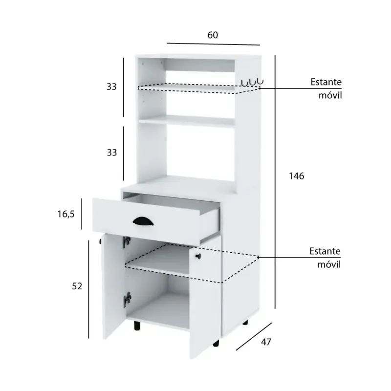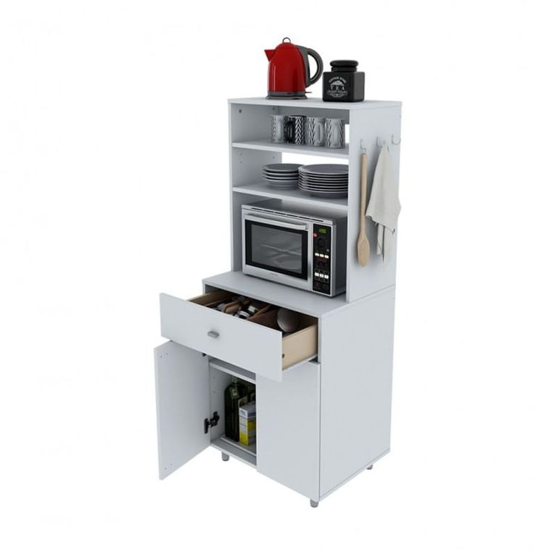 Mueble organizador para tu cocina, pensado para ubicar tu microondas y organizar tus utensilios de cocina al mismo tiempo. Contiene estantes amplios y regulables, y cuenta con ganchos para colgar bolsas, delantales y demás. Un mueble infaltable en tu cocina.