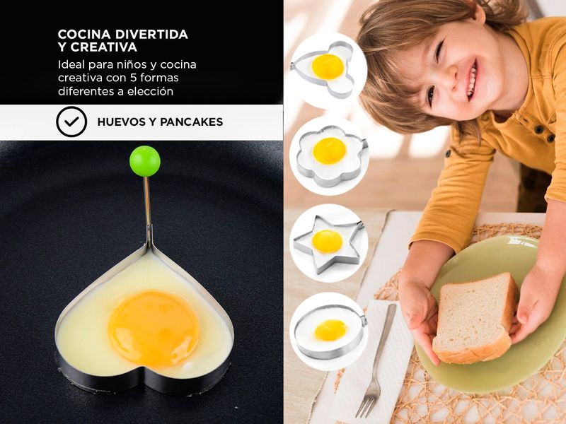 Versatilidad sin Límites: Con cinco formas diferentes, incluyendo círculo, corazón, estrella, cuadrado y flor, este molde te permite crear huevos fritos con formas divertidas y originales, convirtiendo cada desayuno en una experiencia única.