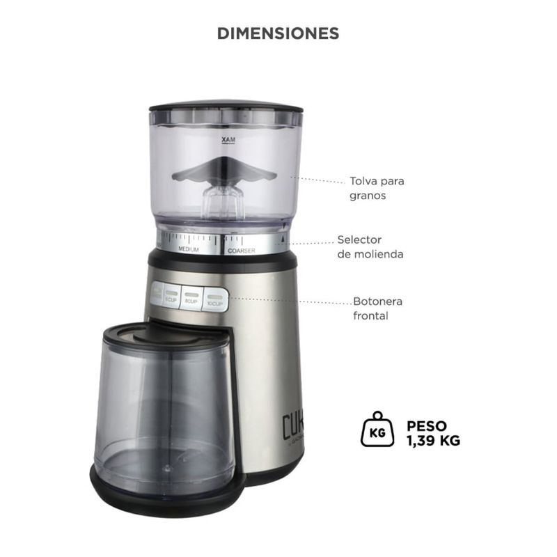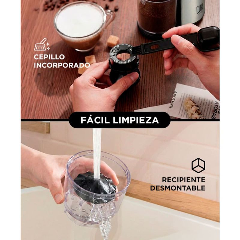 El café molido cae directamente en el recipiente removible, manteniendo el área limpia y ordenada. Ideal para un uso práctico y continuo en el hogar.