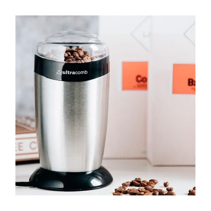 Te presentamos el molinillo eléctrico ULTRACOMB MO-8100ª, Su poderoso motor de 120Watts y cuchillas de acero inoxidable muelen sin esfuerzo granos de café, nueces, pimienta, hierbas y especias secas como almendras. Un acabado de metal liso y base antideslizante lo convierte en una incorporación elegante para su cocina.