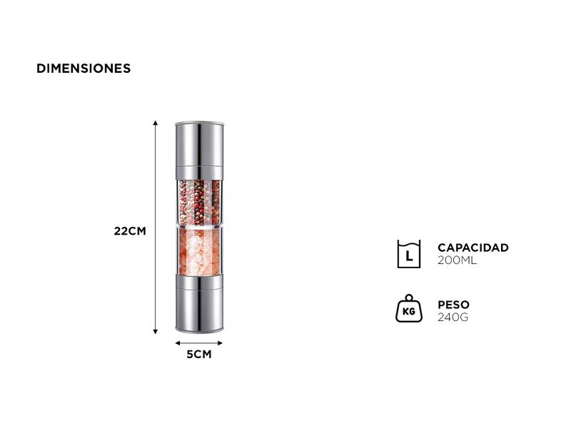 Añadí un toque de sofisticación a tu cocina con nuestro Molinillo Inoxidable 2 en 1 para Sal Gruesa, Pimienta y Especias.