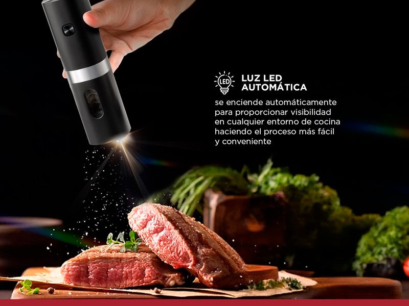 Diseñado para hacer tu experiencia culinaria más sencilla, este molinillo automático muele tus especias, sal o pimienta con solo una simple presión. Su luz LED se enciende automáticamente al estar en funcionamiento, proporcionando visibilidad en cualquier entorno de cocina.