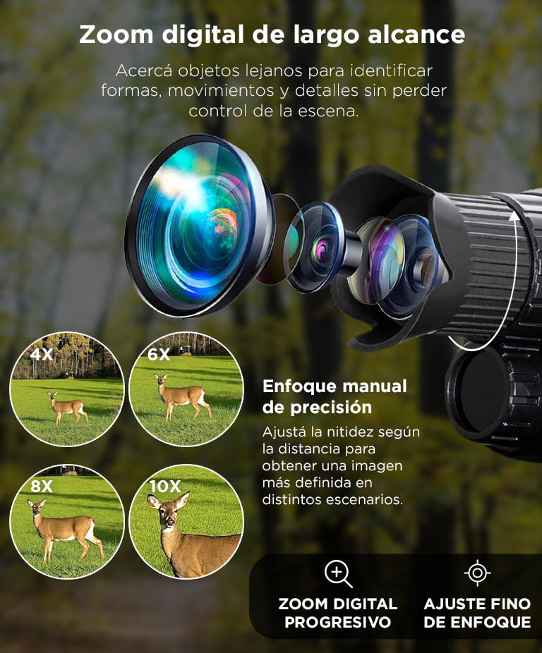 - Lente con enfoque manual que permite ajustar la nitidez segun la distancia del objeto observado