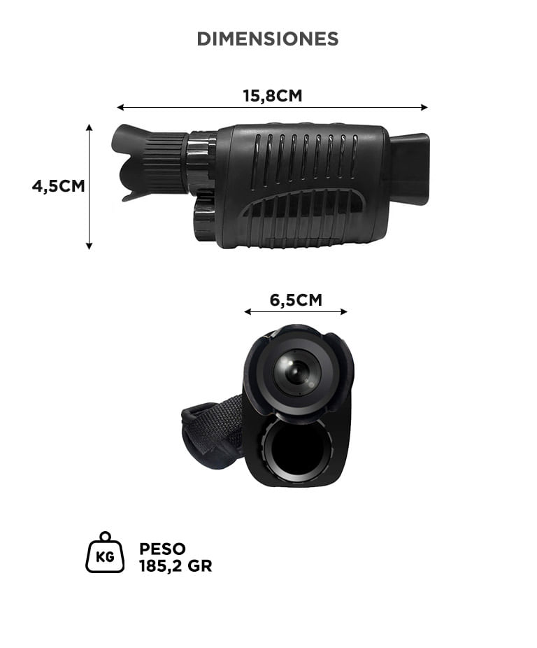 - Monocular de vision nocturna con grabacion de video en resolucion Full HD 1920x1080 que permite registrar imagenes claras de dia y de noche