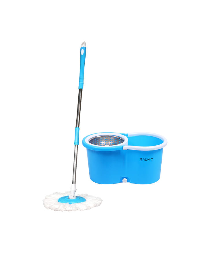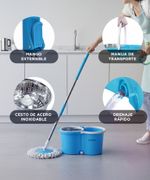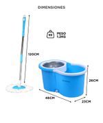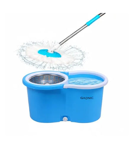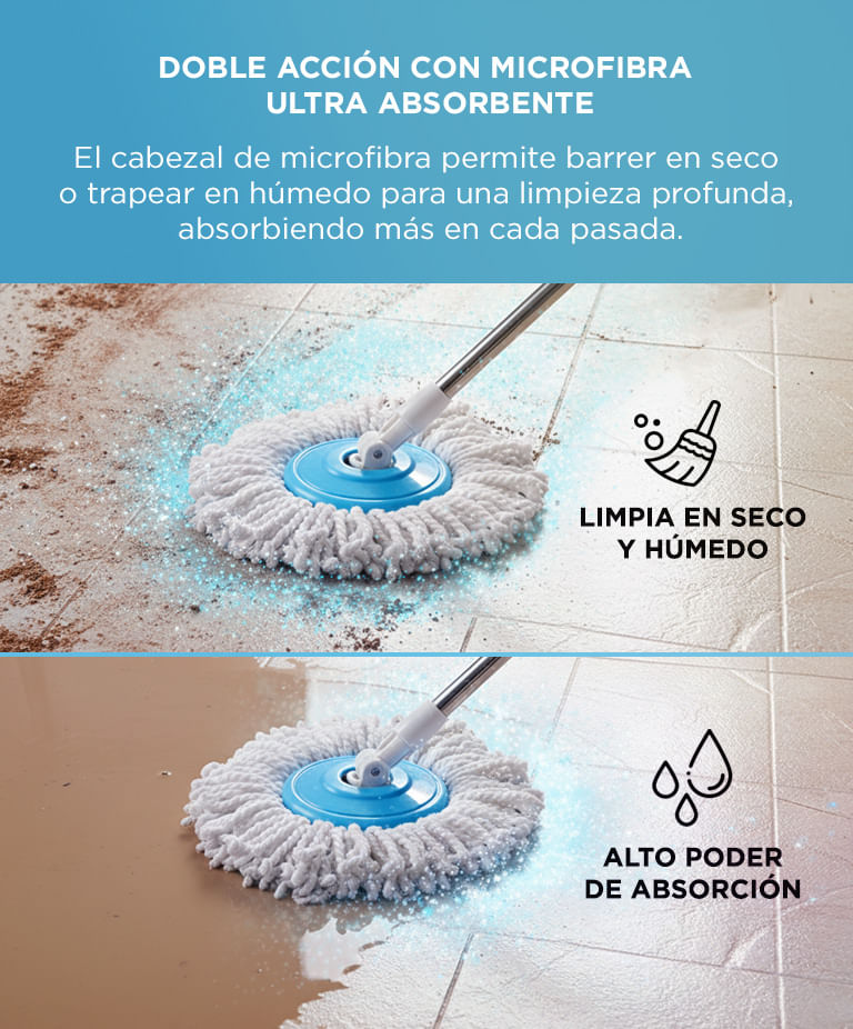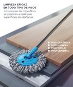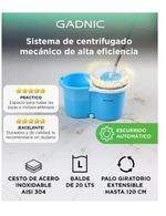 La mopa giratoria Gadnic combina tecnología centrífuga de escurrido automático con microfibra de alta densidad, logrando una limpieza eficiente en seco o en húmedo. Su sistema giratorio de 360° reduce el esfuerzo físico y mantiene tus manos siempre secas.