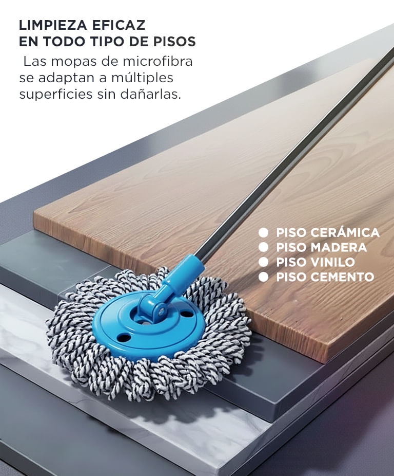 Usala en seco para eliminar polvo, pelos o residuos livianos, y en húmedo para remover manchas, grasa o derrames. Ideal para pisos de cerámica, madera, porcelanato o mármol.
