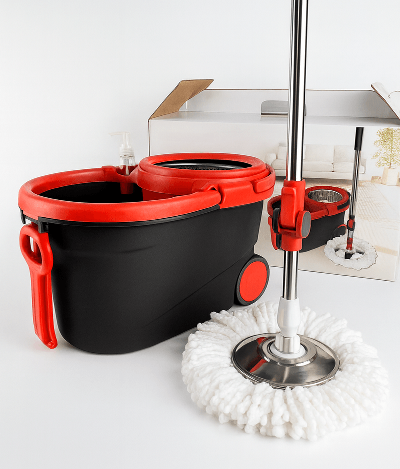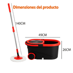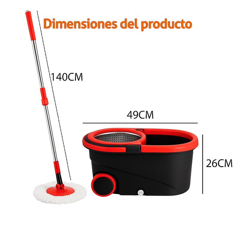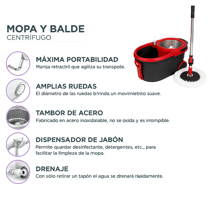 Optimiza tu limpieza con el balde mopa centrífugo de alta resistencia. Su tambor y bastón de acero inoxidable garantizan durabilidad, mientras que su sistema de centrifugado por presión facilita el escurrido sin esfuerzo. Con dispenser de jabón, tapón de desagote y ruedas, es práctico y versátil. Incluye dos paños superabsorbentes y es compatible con repuestos universales.