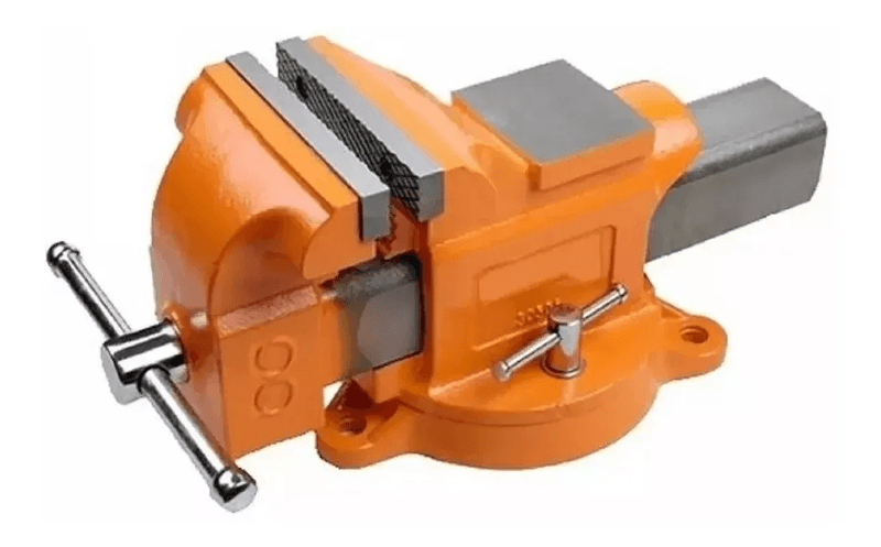 Su diseño incluye mordazas ranuradas que mejoran la fijación y una base perforada que permite instalarla de forma segura sobre la superficie de trabajo.