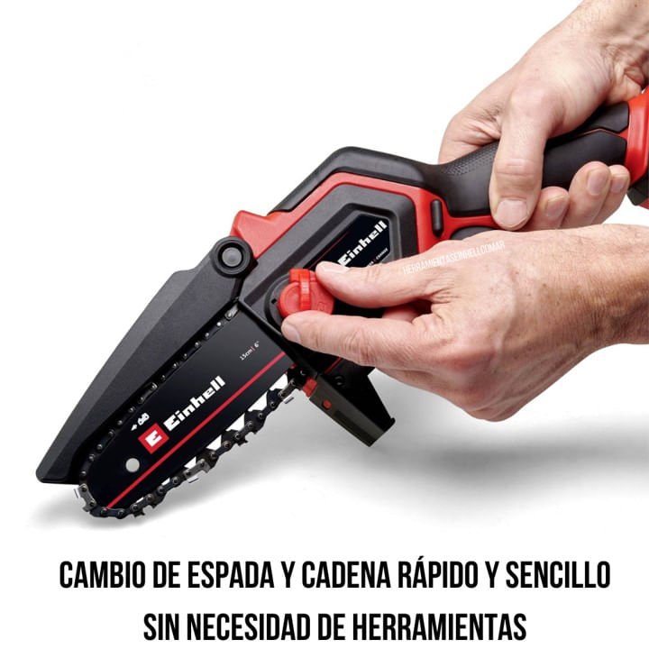 Para un mantenimiento fácil, la hoja y la cadena se pueden cambiar fácilmente y sin herramientas. Para un uso seguro y flexible, la sierra cuenta con un protector de mano y una cubierta de cadena plegable.