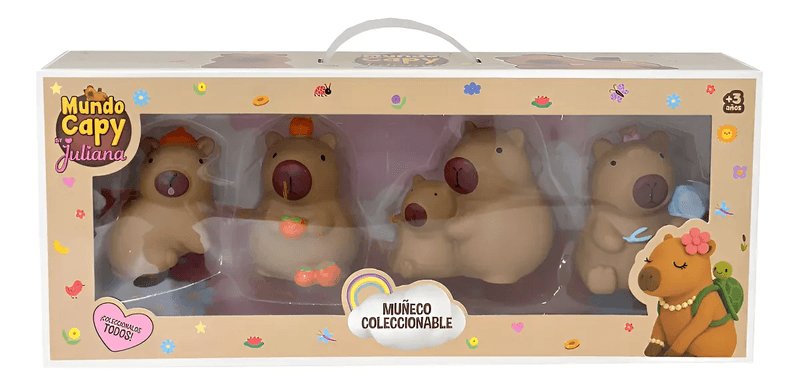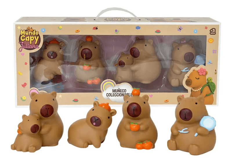 Set de 4 muñecos coleccionables de la tierna familia Capibara, diseñados por Juliana. Perfectos para coleccionar, jugar y decorar.