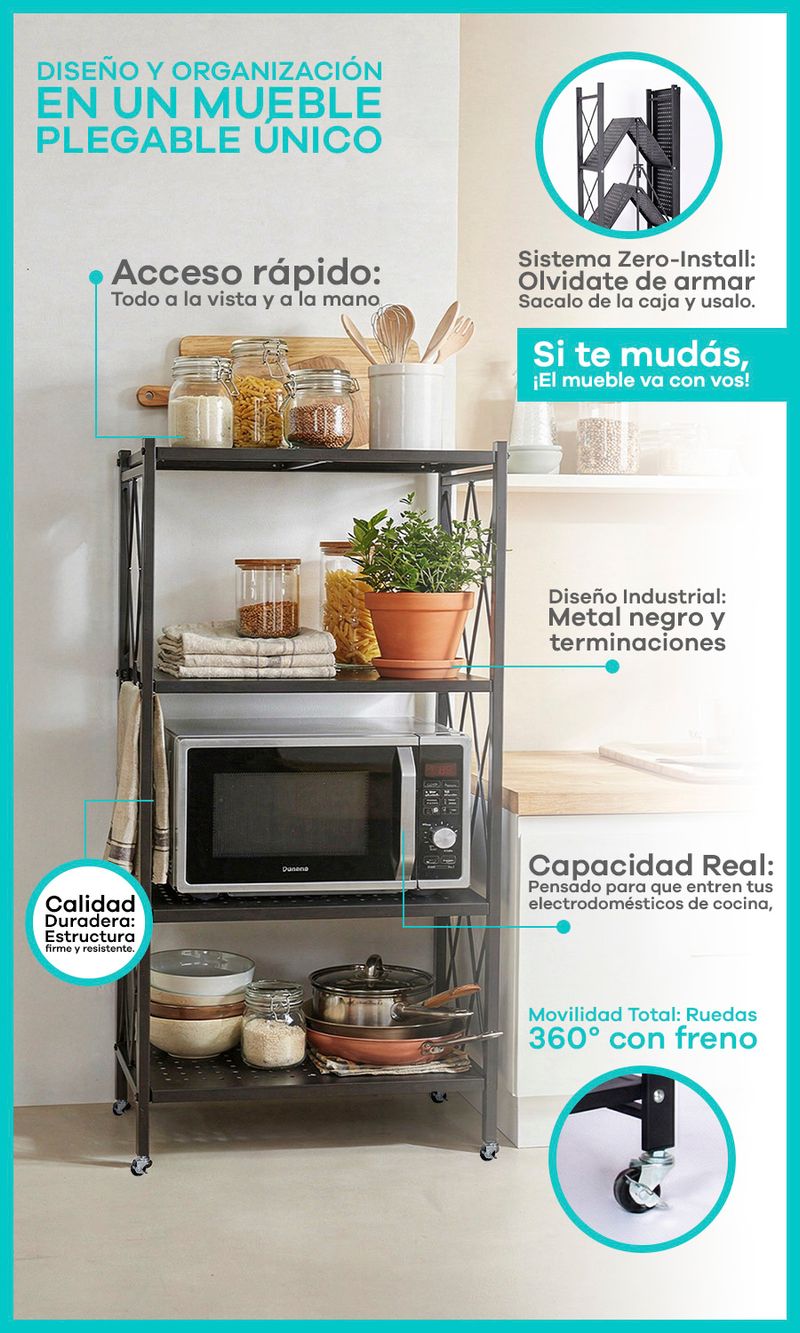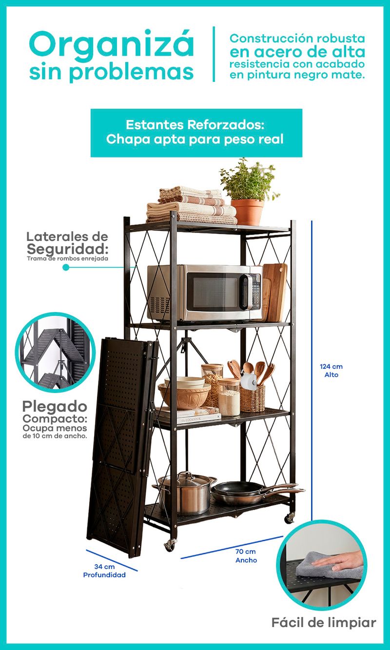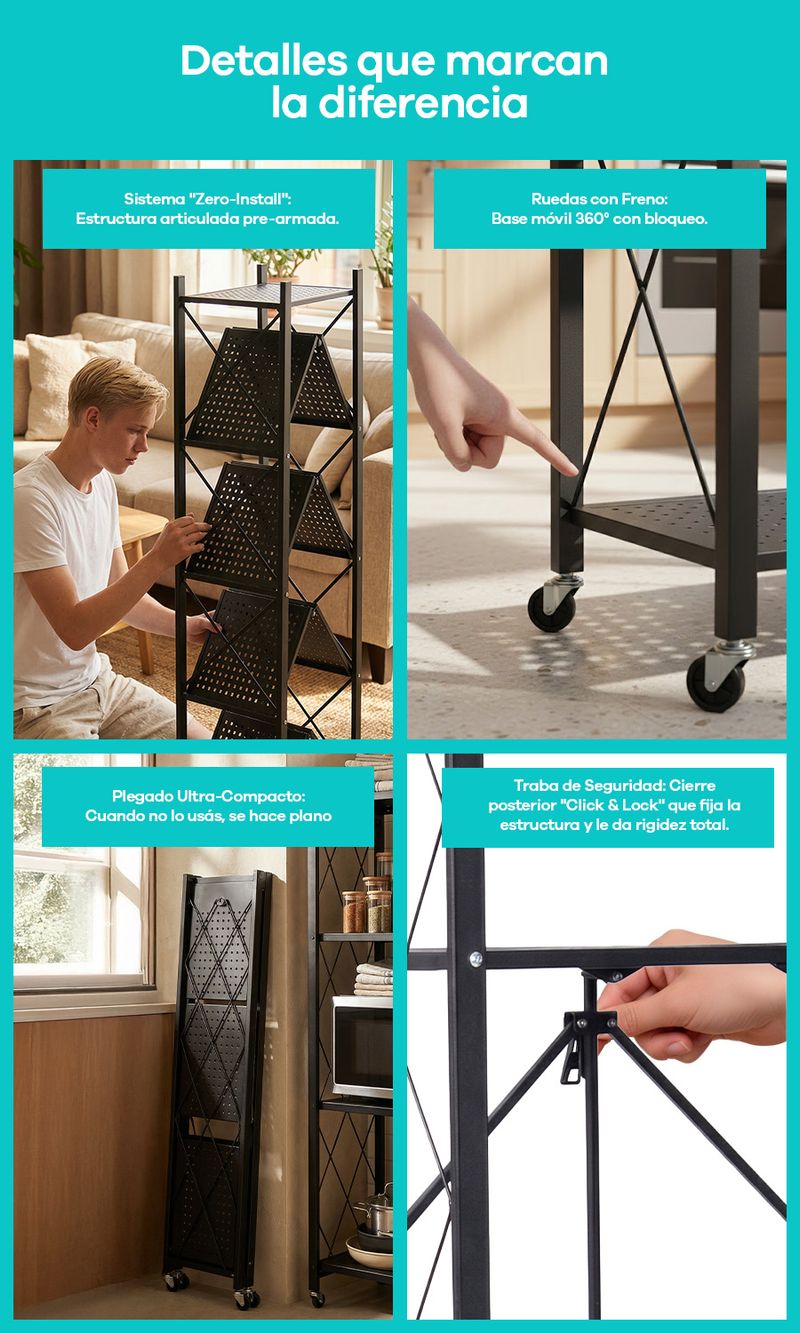 -Movilidad Total: 4 ruedas giratorias para llevar el orden adonde quieras. Incluye frenos para dejarla fija y segura.