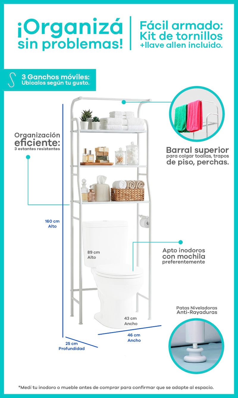 Este mueble organizador es la solución ideal para ganar espacio en ambientes reducidos, ya sea en el baño o la cocina. Su diseño compacto aprovecha el lugar vertical sobre el inodoro, muebles bajos o rincones estrechos, manteniendo todo ordenado y accesible.