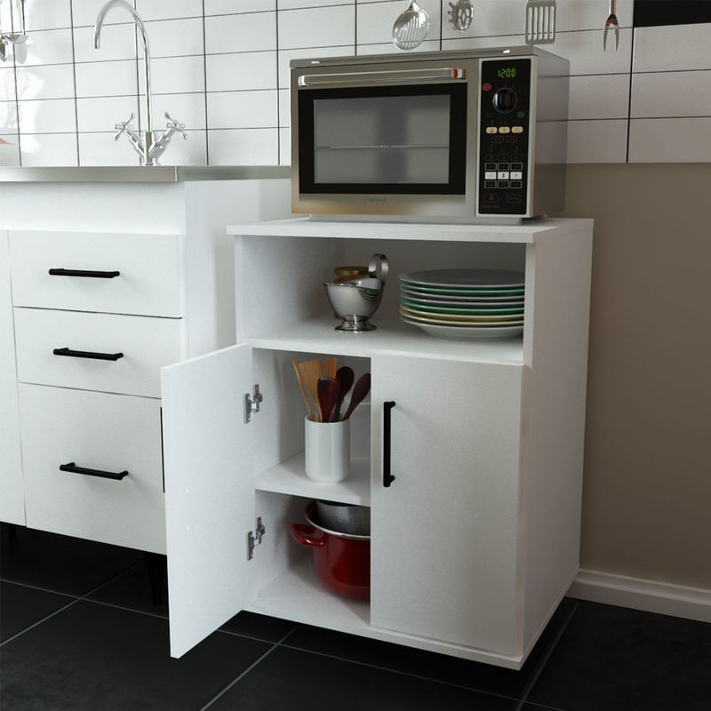 Ubicá el microondas en un lugar seguro. Este organizador pretende evitar que uses la mesada para ese tipo de electrodomésticos. De esta forma, no solo volvés tu cocina más segura sino también ganás espacio de trabajo a la hora de cocinar. Cuenta con un espacio para ubicar microondas, un estante y un lugar de guardado con un estante en su interior.