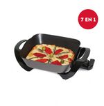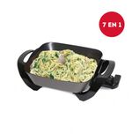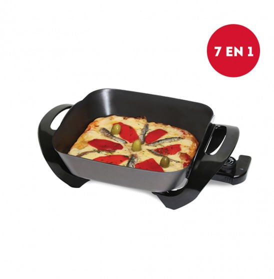 COCINA ELÉCTRICA KITCHINET Modelo: AK100 7 EN 1 · Parrilla, horno, sartén, cocina eléctrica, paellera, cocina al vapor, prepara fondue. · Ideal para preparar salsas, guisos, cazuelas, hervir alimentos, freír y cocinar vegetales. · Tapa de vidrio templado con salida de vapor. · Termostato con 5 niveles de temperatura y manija eyectora. · Base antiadherente enlozada. · Parrilla metálica. · Muy fácil de usar y limpiar. · Medidas: 27x27cm. Profundidad: 7.5cm. · Potencia 1500 W.