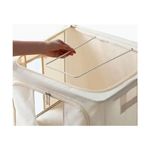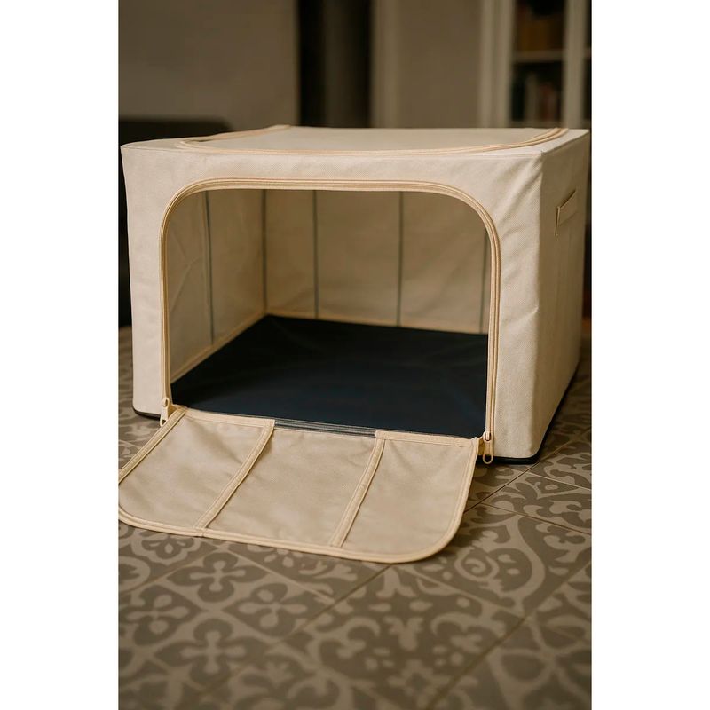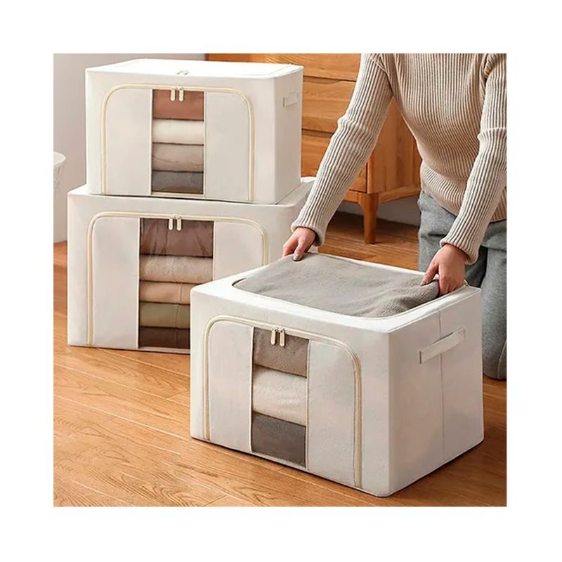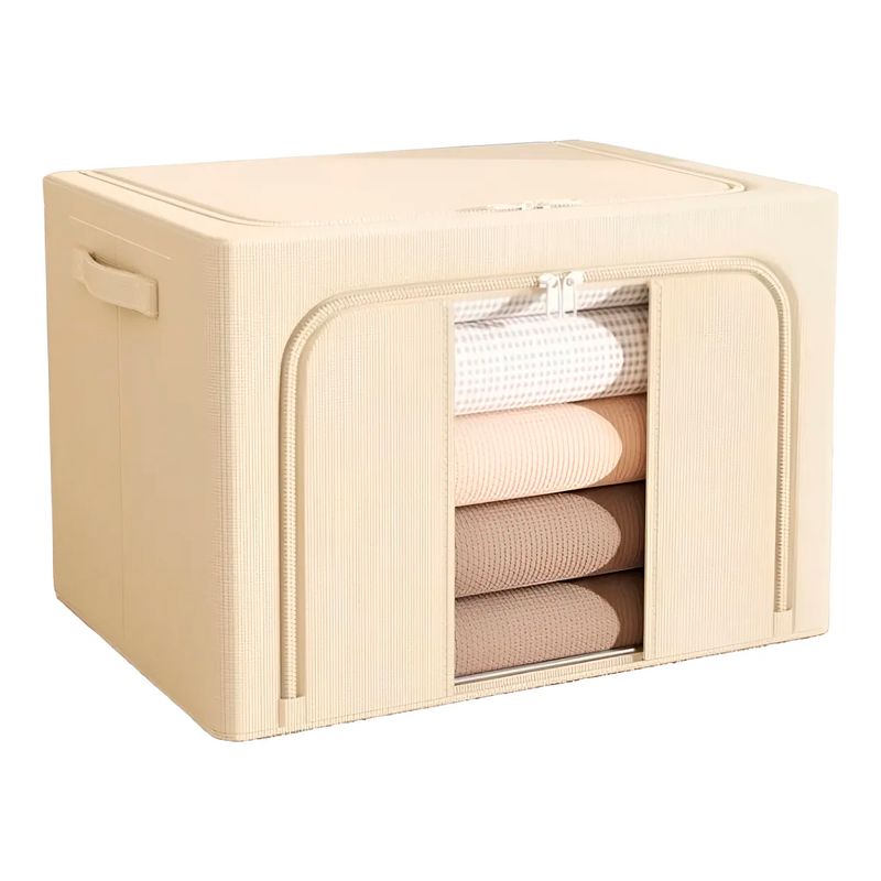 Organizador Box XL de tela beige con cierres: Caja multiorganizadora con estructura de metal. Cuenta con cierre superior y frontal, pequeñas ventanas con nylon cristal para poder ver el contenido. Esta caja es ideal para almacear acolchados, ropa de cama, ropa de invierno o textiles de uso poco frecuente.