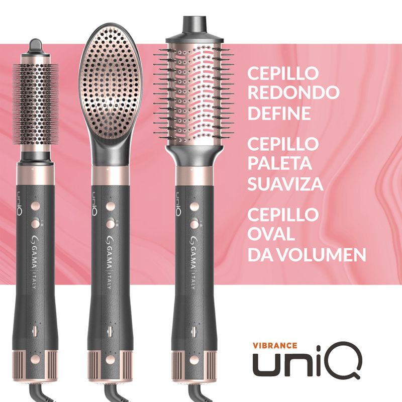 El Multi Styler UniQ Vibrance 8 en 1 combina secador, rizador y cepillo en un solo dispositivo, permitiéndote secar, modelar, alisar, rizar, ondular, suavizar, dar volumen y definir con resultados profesionales en casa.