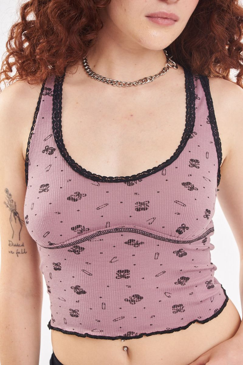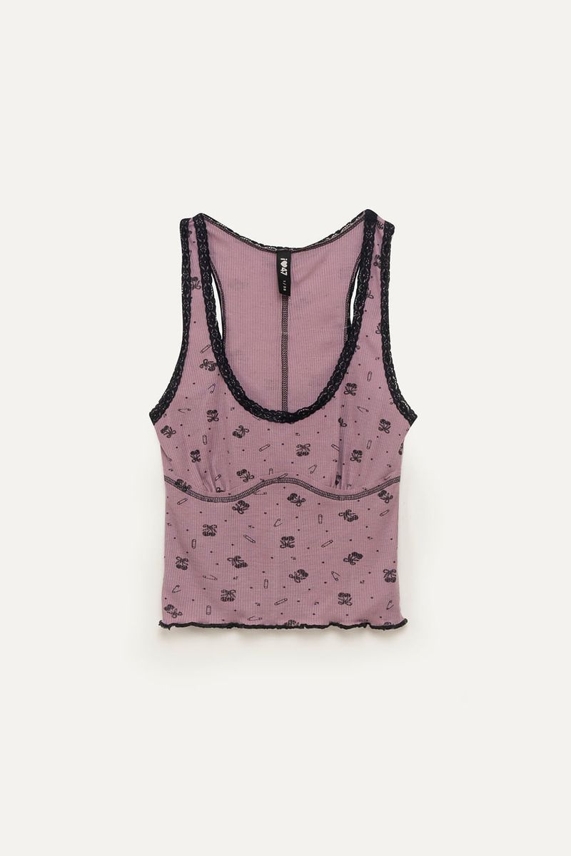 Musculosa de morley viscosa, con puntilla en escote y sisas. Estampado full con diseño exclusivo de la marca. Bordador a contratono. Largo hasta la cadera.