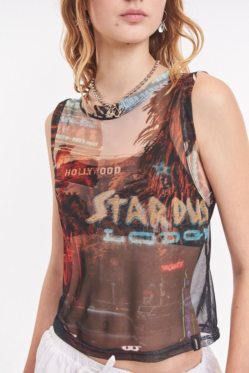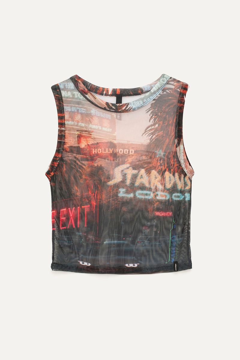 Musculosa escote redondo de microtul sublimada con diseño exclusivo de la marca. Vivos en cuello y sisa anchos. Largo hasta la cadera. Grifa institucional.