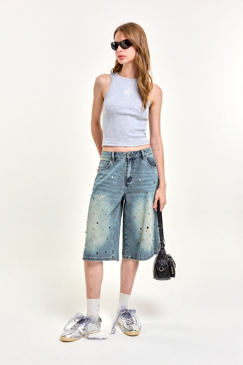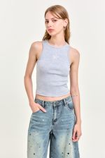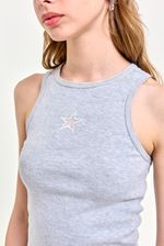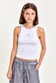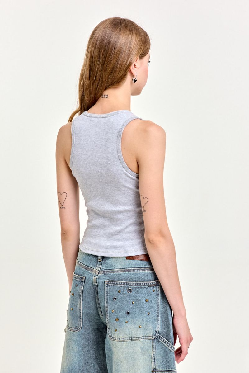 Musculosa de algodón de calce slim, largo hasta la cadera, con recorte central y bordado de microtul al tono. Lleva grifa institucional en el ruedo. Un básico con detalle especial, ideal para usar con un jean wide leg o short de gabardina.