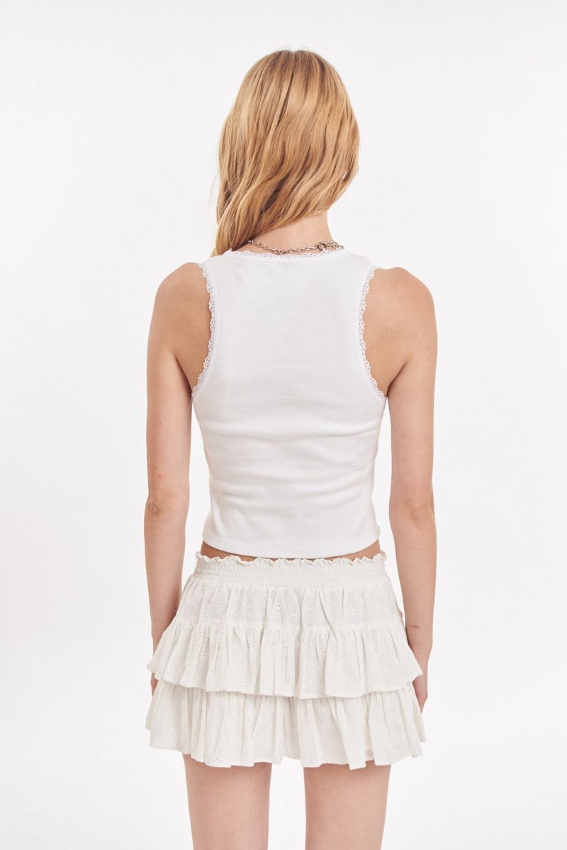 Musculosa de ribb, con puntilla en sisas y escote. Estampa centrada en frente con detalles de hotfixx. Grifa institucional.