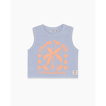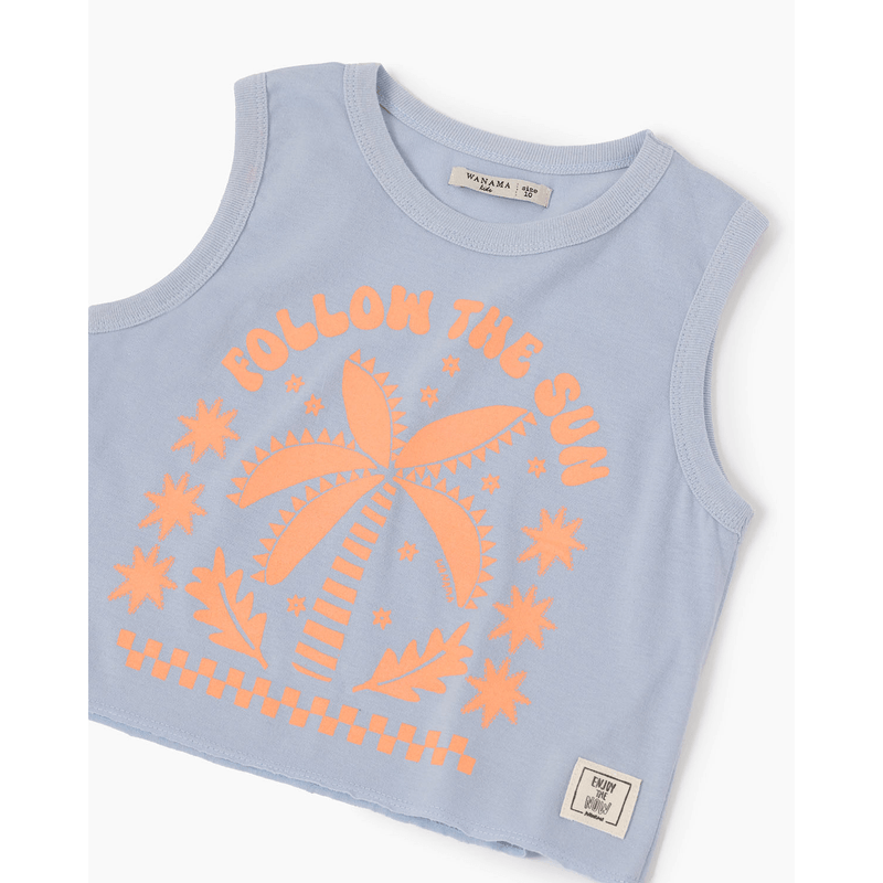 Musculosa crop confeccionada en 100% algodon. Posee estampa en frente, diseño exclusivo de esta temporada. Calce regular, largo por debajo de la cintura. Detalle de ruedo al corte que le da un look mas surfero.