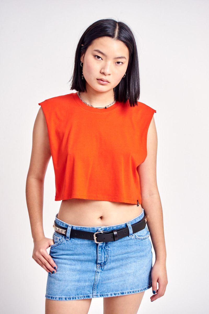 Musculosa basica de jersey. Sisas al corte. Cuello redondo aplicado. Largo por debajo de la cintura. Molderia acampanada. Grifa institucional en ruedo izquierdo.