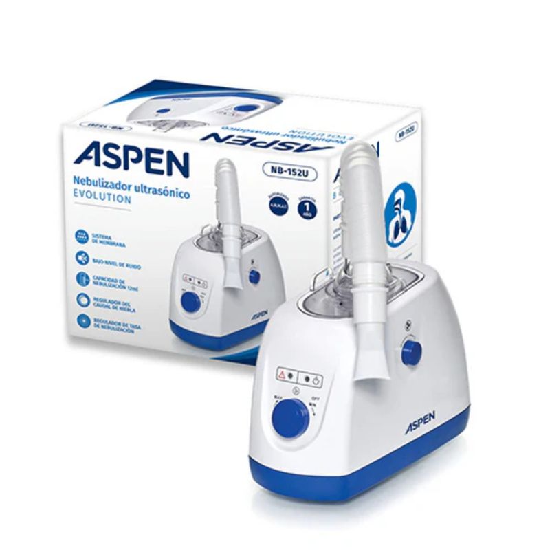 El nebulizador ultrasónico Aspen NB-152U Evolution es un dispositivo de uso doméstico que produce micropartículas de vapor en un tratamiento silencioso para afecciones respiratorias altas. Es adecuado para la nebulización rápida de soluciones y medicamentos líquidos