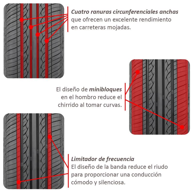 - Diseño optimizado de la banda de rodadura, que extiende la vida útil del neumático.