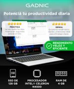 La Notebook Gadnic 14" Intel Celeron N4500 ofrece un desempeño ideal para estudio, navegación y trabajo en la nube. Su arquitectura optimizada permite ejecutar múltiples tareas básicas sin interrupciones.