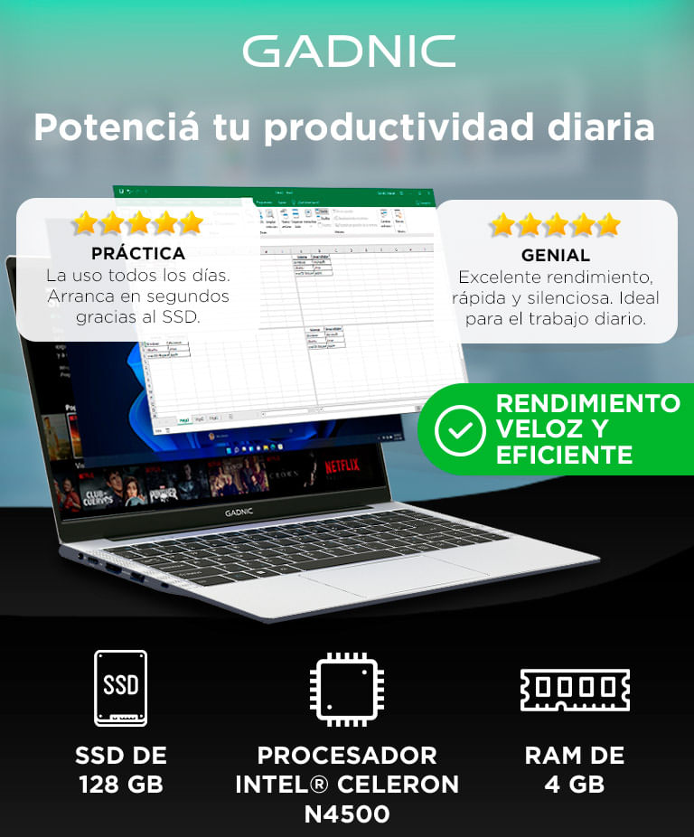 El disco sólido acelera el arranque del sistema y reduce tiempos de carga en documentos y aplicaciones. Esta mejora se traduce en una experiencia más fluida al trabajar o estudiar con la Notebook Gadnic 14".