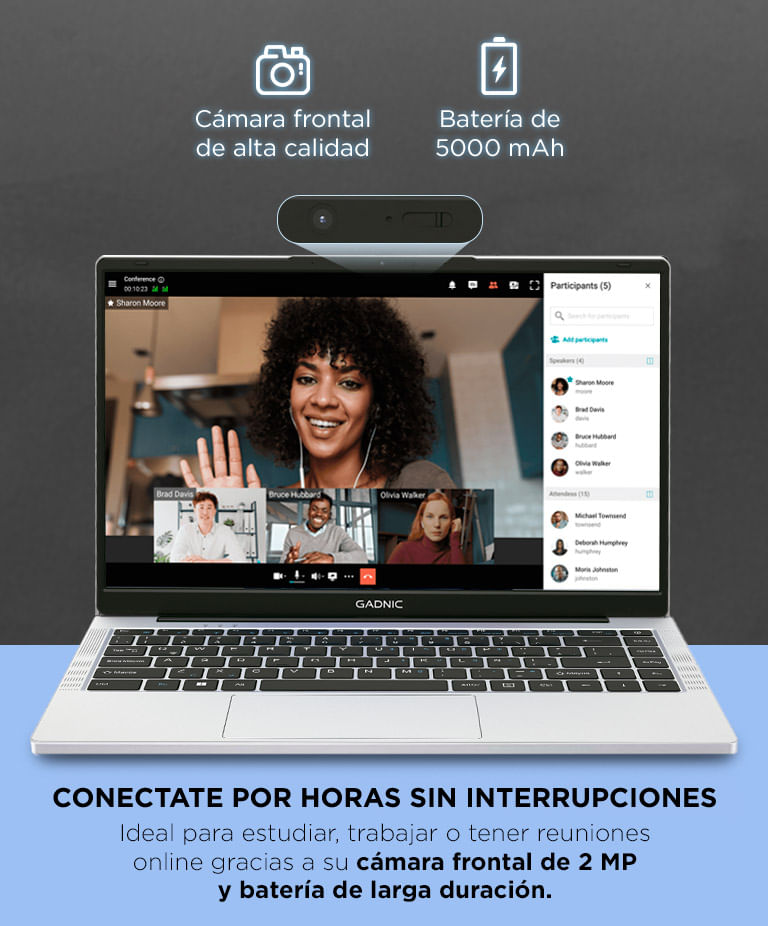 La batería de 5000 mAh ofrece entre 6 y 8 horas de uso típico, ideal para quienes necesitan movilidad sin depender del cargador. La Notebook Gadnic 14" acompaña jornadas completas sin interrupciones.