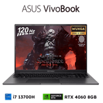ASUS SERIES VivoBookPROCESADOR Intel Core i7-13700H 3.7Ghz Turbo 5.0Ghz 14 NcleosTARJETA DE VIDEO NVIDIA Geforce RTX 4060 8GB GDDR6MEMORIA RAM 16GB DDR4DISCO DURO 512GB SSD Slido M.2PANTALLA 16 WUXGA 19201200 120HzTECLADO Teclado iluminado SISTEMA OPERATIVO Windows 11 HomeWEBCAM Si HD 720pCONECTIVIDAD Bluetooth 5.3 Wi-Fi 6E 802.11ax Dual band 11ENTRADA HDMI 1 x HDMI 2.1ENTRADA USB TIPO-A 2 x USB 3.2 Gen 1ENTRADA USB TIPO-C1 x Thunderbolt 4BATERA 3 celdas