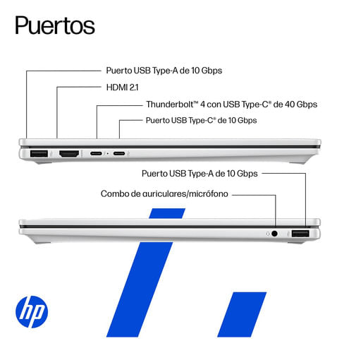 Puertos 2 USB Type-A con velocidad de 10Gbps; 1 HDMI 2.1; 1 combo de diadema/micrófono; 1 Thunderbolt 4 con USB Type-C con velocidad de 40Gbps (USB Power Delivery 3.1, DisplayPort 2.1, HP Sleep and Charge); 1 USB Type-C con velocidad de 10Gbps (USB Power Delivery 3.1, DisplayPort 1.4a, HP Sleep and Charge)