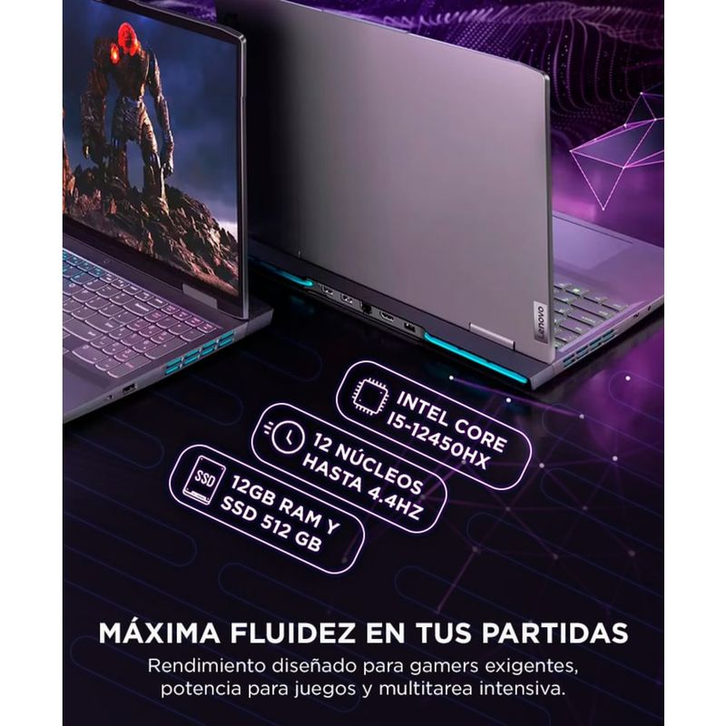 La Lenovo LOQ 15 integra el procesador Intel Core i5-12450HX de 12 núcleos, combinado con 12GB de RAM DDR5 y un rápido SSD de 512GB, garantizando potencia para juegos y multitarea intensiva.