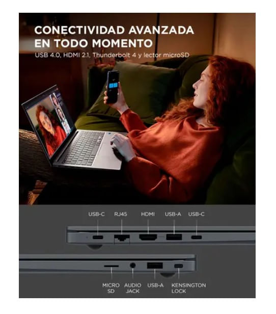 Ofrece una amplia variedad de puertos como HDMI, USB-A, USB-C, ranura micro-SD y RJ45, permitiendo conectar múltiples dispositivos fácilmente.