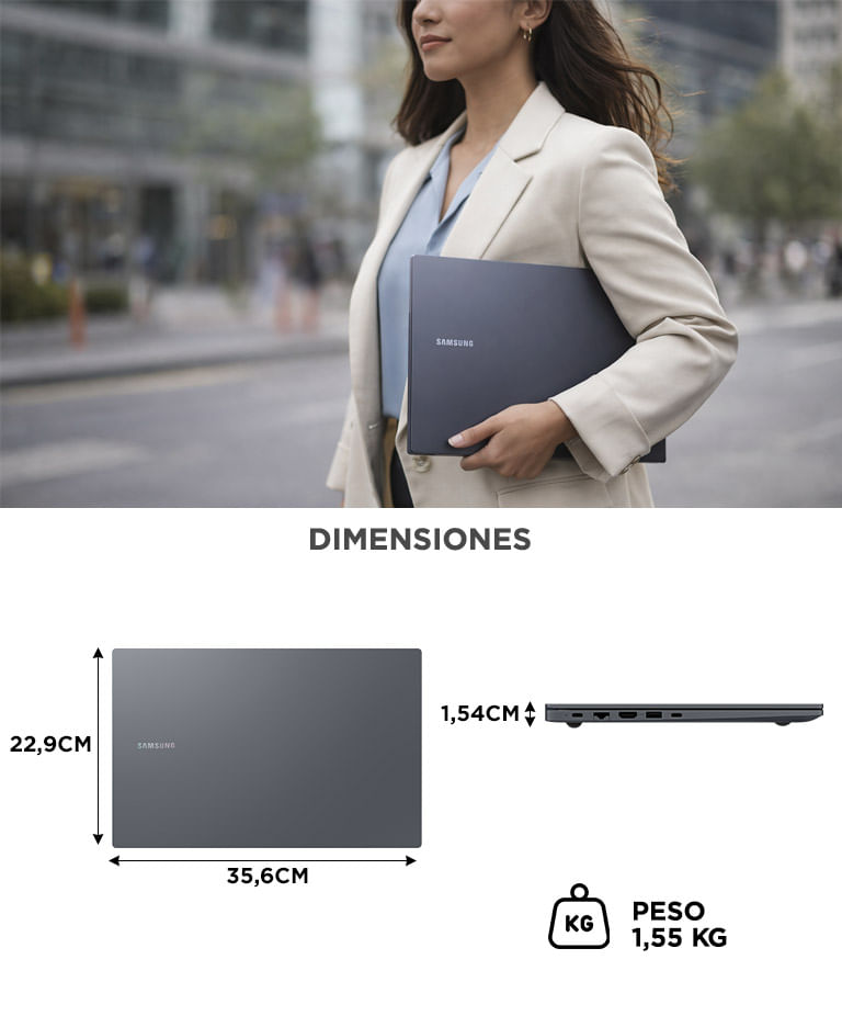 Con solo 1.55 kg, combina portabilidad y múltiples puertos físicos para conectar periféricos, pantallas y redes sin adaptadores adicionales.
