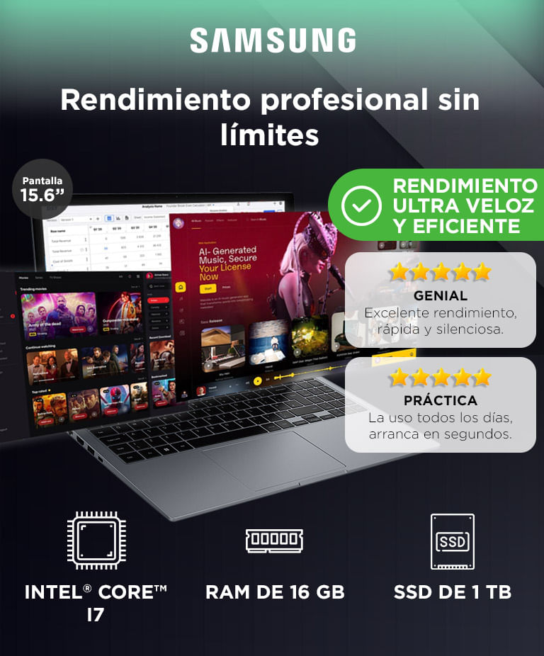 La notebook Samsung Galaxy Book4 incorpora un procesador Intel Core i7-1355U que permite ejecutar tareas exigentes, trabajar con múltiples aplicaciones y mantener un rendimiento fluido durante todo el día.