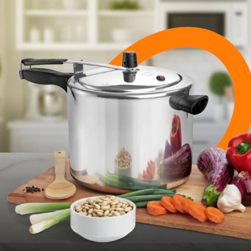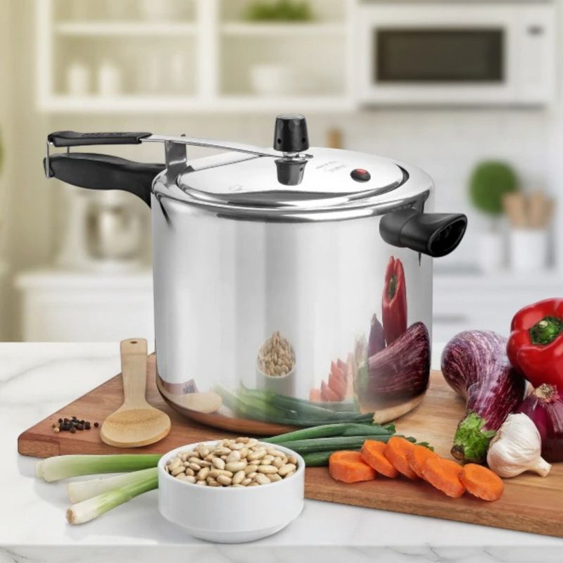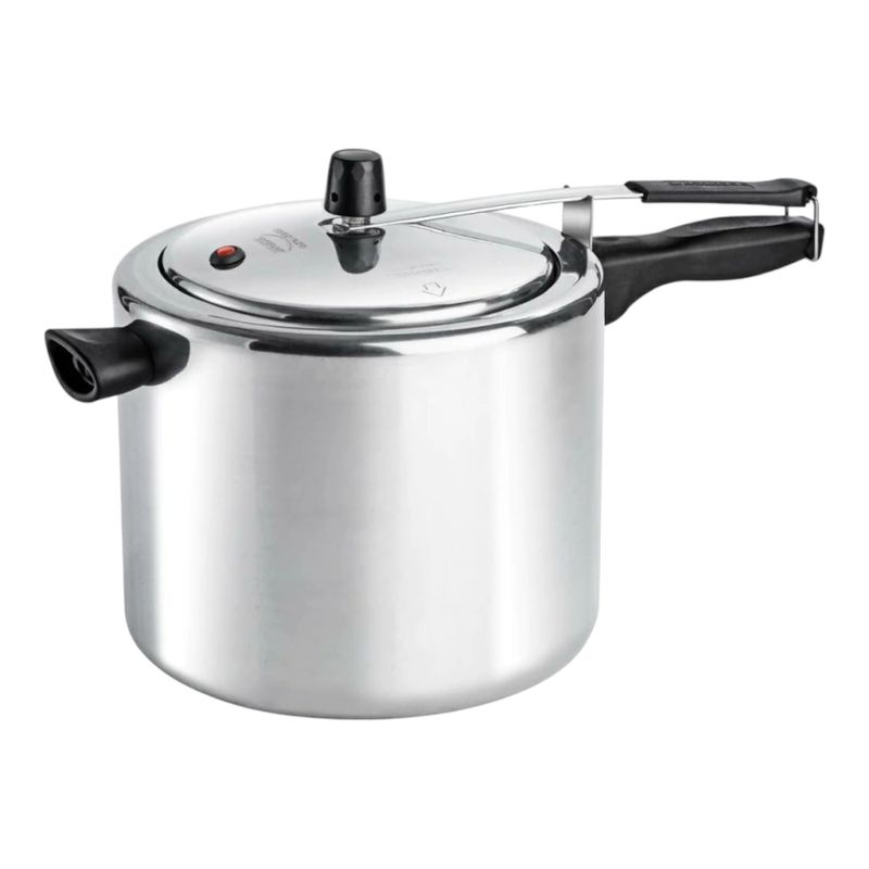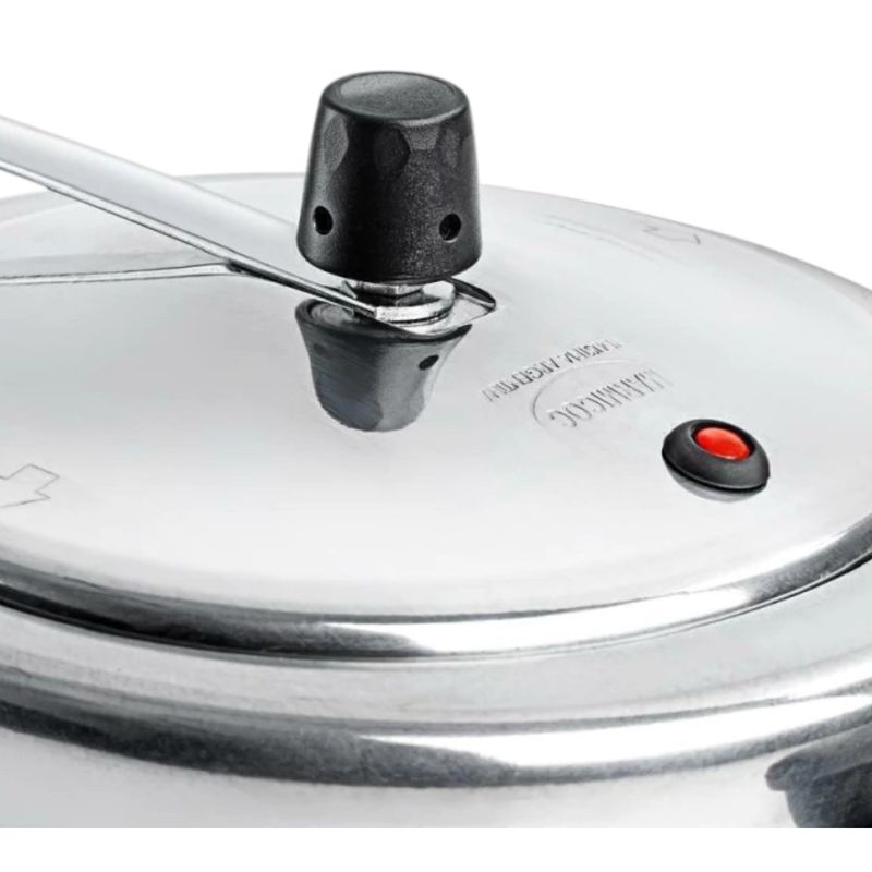 - Mangos y asas de baquelita, fleje de acero cromado y válvula de seguridad.