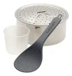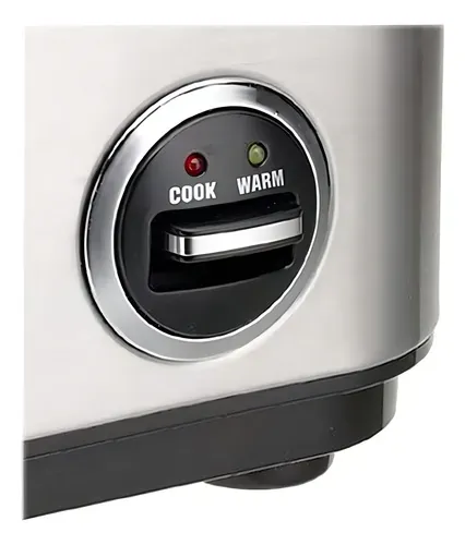 La olla arrocera también cambia automáticamente a "Calentar" una vez cocido el arroz, manteniendo sus platos calientes mientras que las asas cromadas se mantienen frías al tacto.