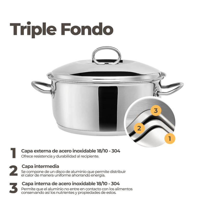 ✔ Triple fondo encapsulado: Distribuye el calor de manera uniforme, asegurando una cocción pareja y eficiente, ahorrando energía y manteniendo los alimentos calientes por más tiempo.