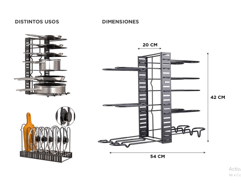 Con su diseño versátil, nuestro organizador ofrece tres formas de uso diferentes, adaptándose a tus necesidades y espacio disponible. Puedes utilizarlo como un soporte horizontal para colocar tus ollas y sartenes en fila, como un soporte vertical con ambos brazos para apilarlos de manera segura, o incluso como un un soporte vertical con un solo brazo para mantener tu batería de cocina ordenada y fácilmente accesible.