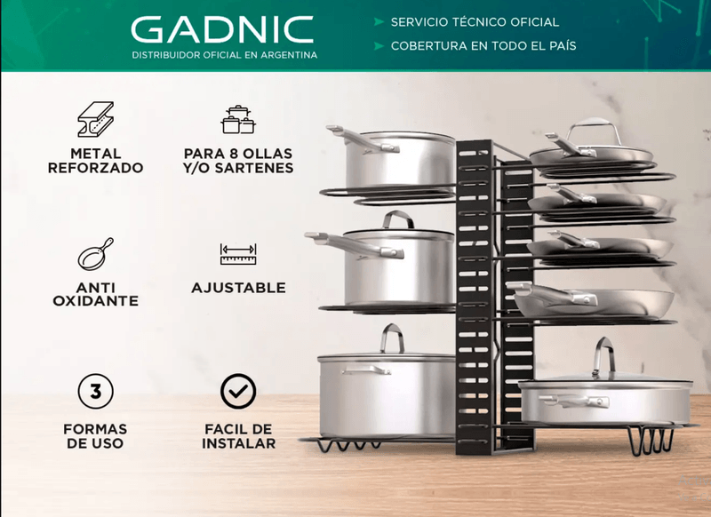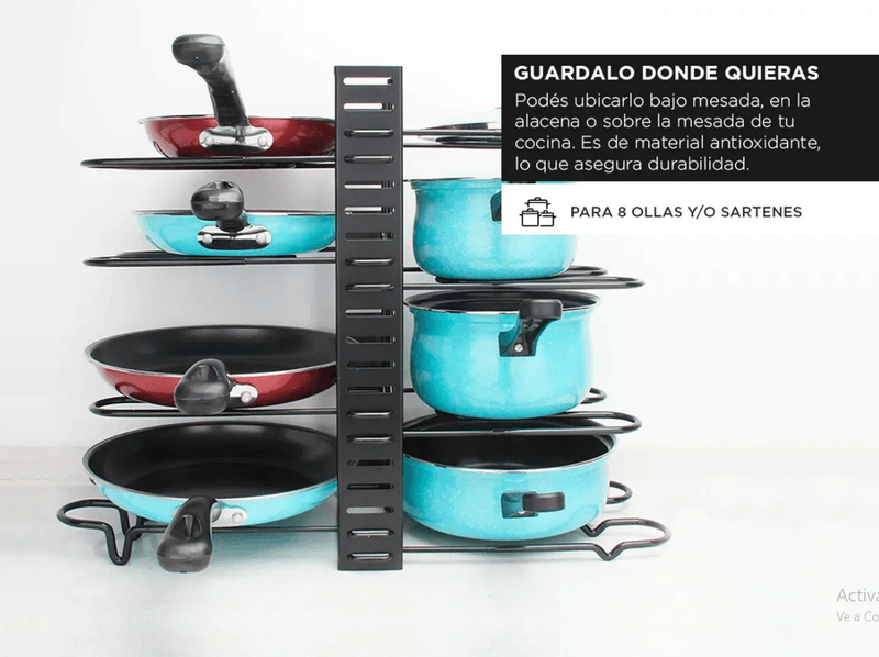 Construido con metal reforzado, nuestro organizador garantiza una capacidad máxima de 8 ollas y/o sartenes, permitiéndote tener todos tus utensilios de cocina en un solo lugar y al alcance de tu mano. Su diseño compacto y eficiente te ayuda a ahorrar espacio en tus armarios y mantener tu cocina organizada y libre de desorden.